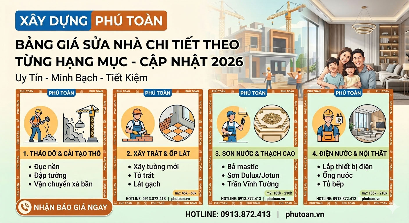 2. Bảng giá sửa nhà chi tiết tại Phú Toàn (Cập nhật 2026)