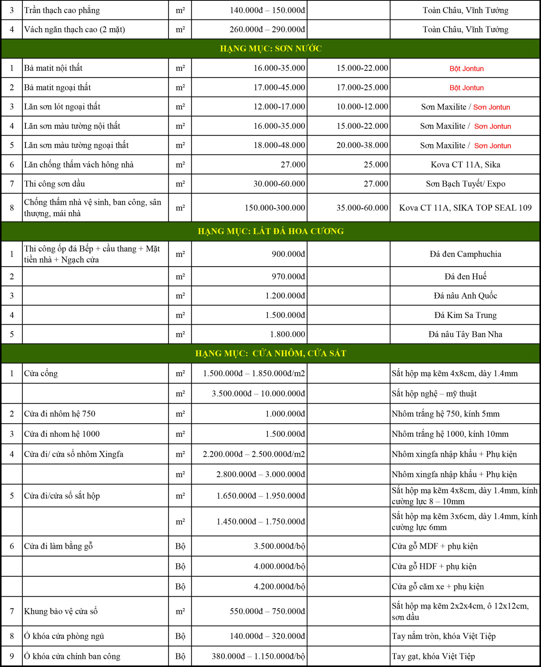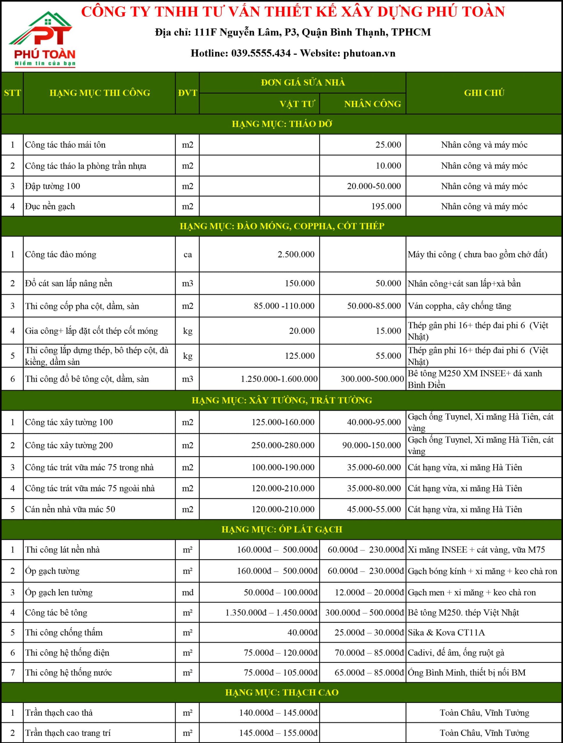 Để có dự toán chính xác nhất, quí vị nên bóc tách khối lượng công việc theo từng hạng mục. Dưới đây là bảng giá sửa nhà tại TPHCM chi tiết, phân loại theo từng cấp độ vật tư để bạn dễ dàng lựa chọn. (Đơn giá đã bao gồm cả nhân công và vật tư).