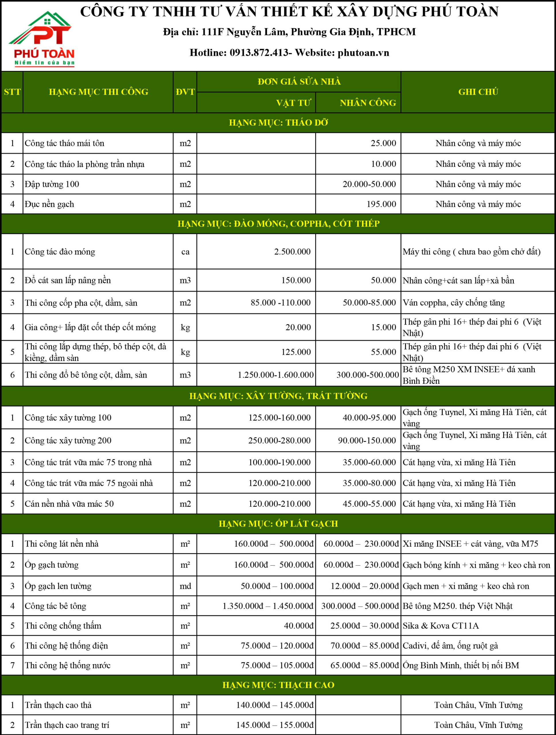 Lưu ý: Đơn giá thực tế có thể thay đổi tùy thuộc vào vị trí và điều kiện thi công. Liên hệ hotline Phú Toàn để nhận báo giá chính xác nhất.