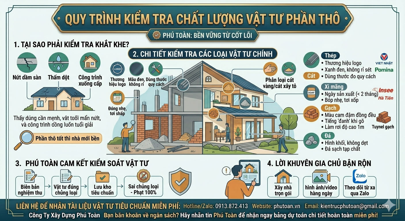 Trong xây dựng, "phần thô tốt thì nhà mới bền". Tuy nhiên, không phải gia chủ nào cũng am hiểu cách nhận biết vật liệu chuẩn. Bài viết này Phú Toàn sẽ hướng dẫn chi tiết quy trình kiểm tra chất lượng vật tư phần thô để bạn có thể tự mình giám sát hoặc tin tưởng tuyệt đối vào quy trình quản lý nghiêm ngặt của chúng tôi.